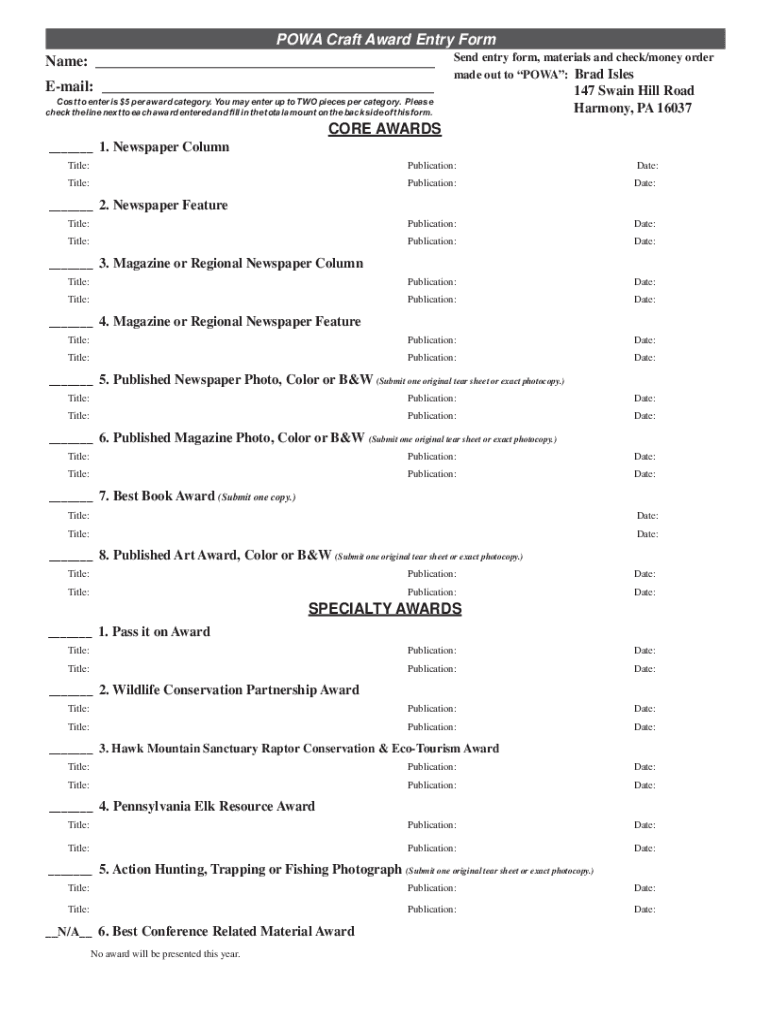 IOWA Craft Award Entry Form Name: Send entry form, materials and check/money order Email: made out to IOWA: Brad IslesCost to enter is $5 per award category. You may enter up to TWO pieces per category.
