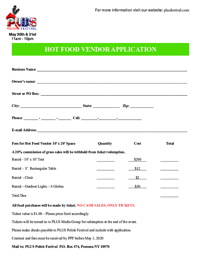 For more information visit our website: plus festival. Comma 30th & 31st 11am 10pmHOT FOOD VENDOR APPLICATION Business Name: Owners name: Street or PO Box: City: State: Zip: Phone: Cell: Email Address: