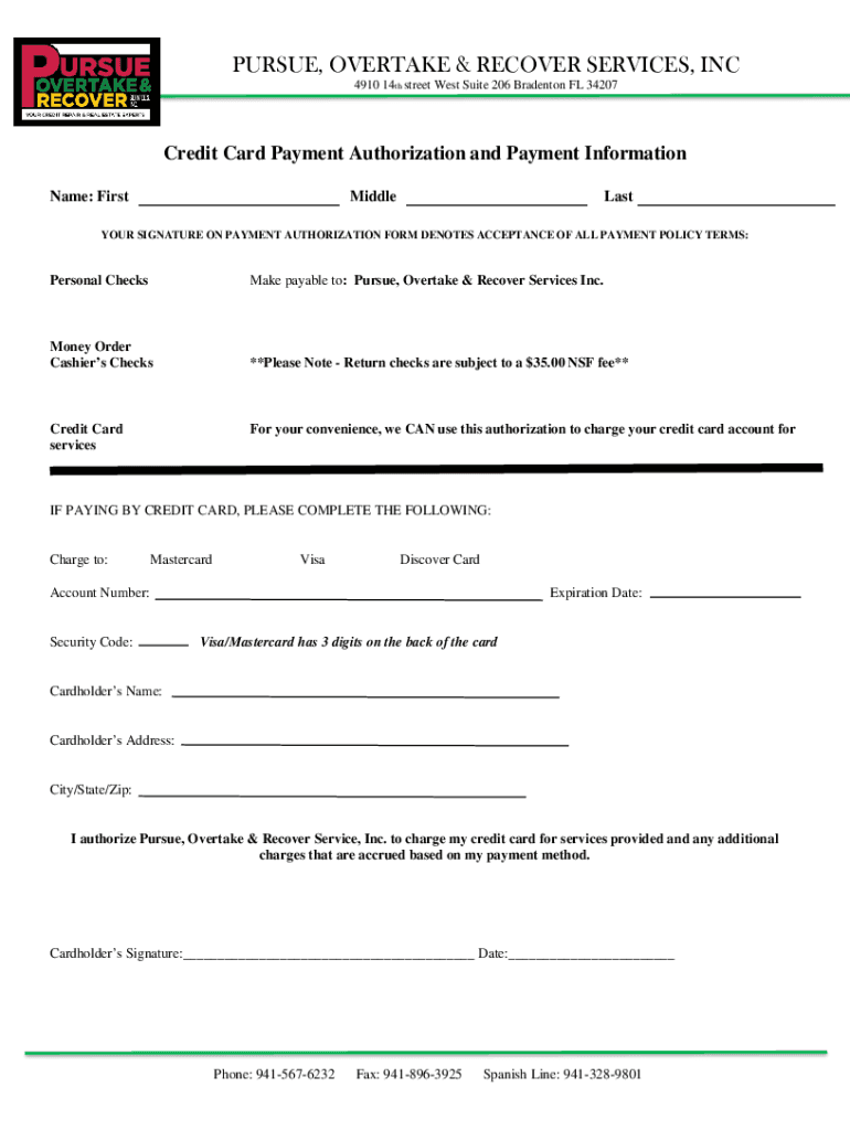 PURSUE, OVERTAKE & RECOVER SERVICES, INC 4910 14th street West Suite 206 Bradenton FL 34207Credit Card Payment Authorization and Payment Information Name: FirstMiddleLastYOUR SIGNATURE ON PAYMENT