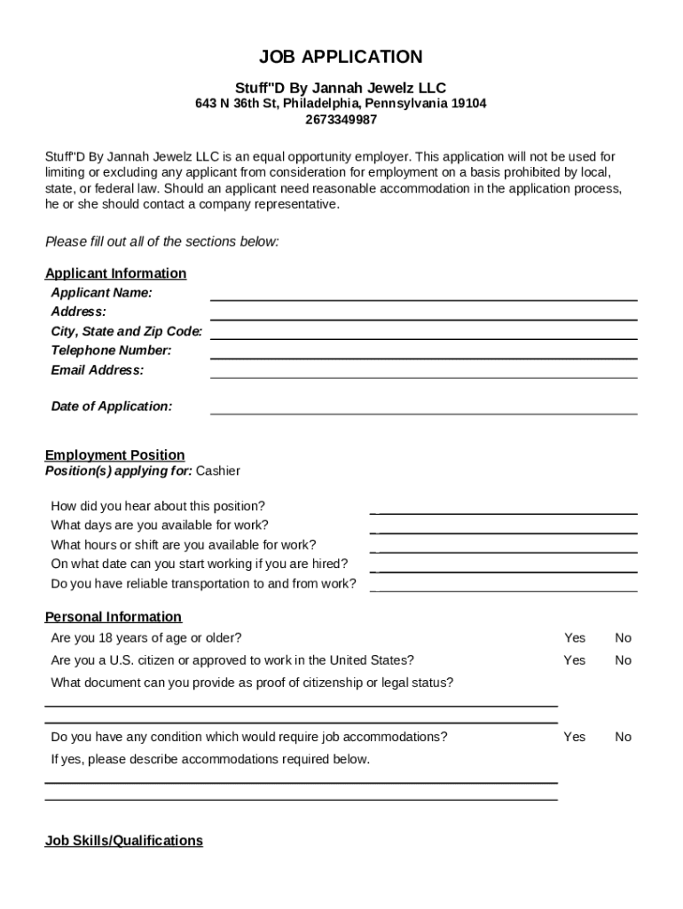 JOB APPLICATION Stuff “D By Hannah Jewel LLC 643 N 36th St, Philadelphia, Pennsylvania 19104 2673349987 Stuff “D By Hannah Jewel LLC is an equal opportunity employer. This application will not