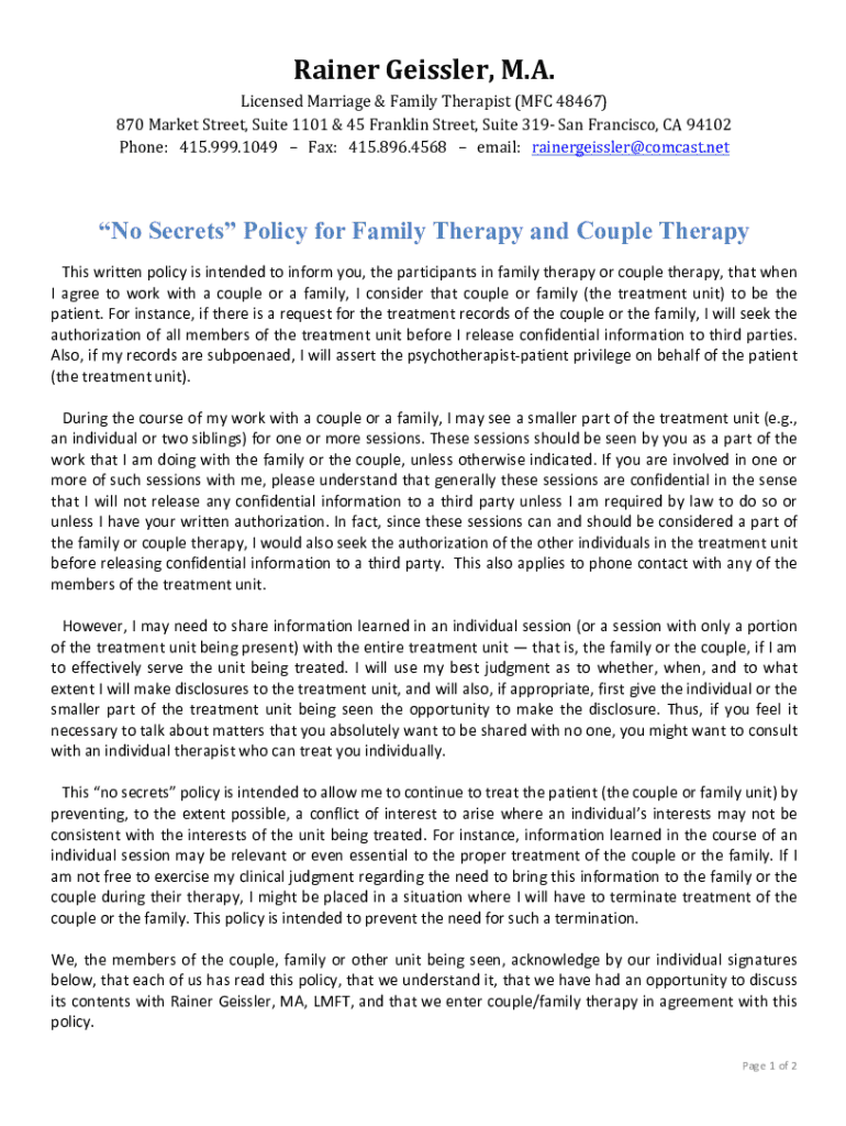 RainerGeissler, M.A. LicensedMarriage&FamilyTherapist(MFC48467) 870MarketStreet,Suite1101&45FranklinStreet,Suite319SanFrancisco,CA94102 Phone:415.999.1049Fax:415.896.4568email:rainergeissler Comcast.net