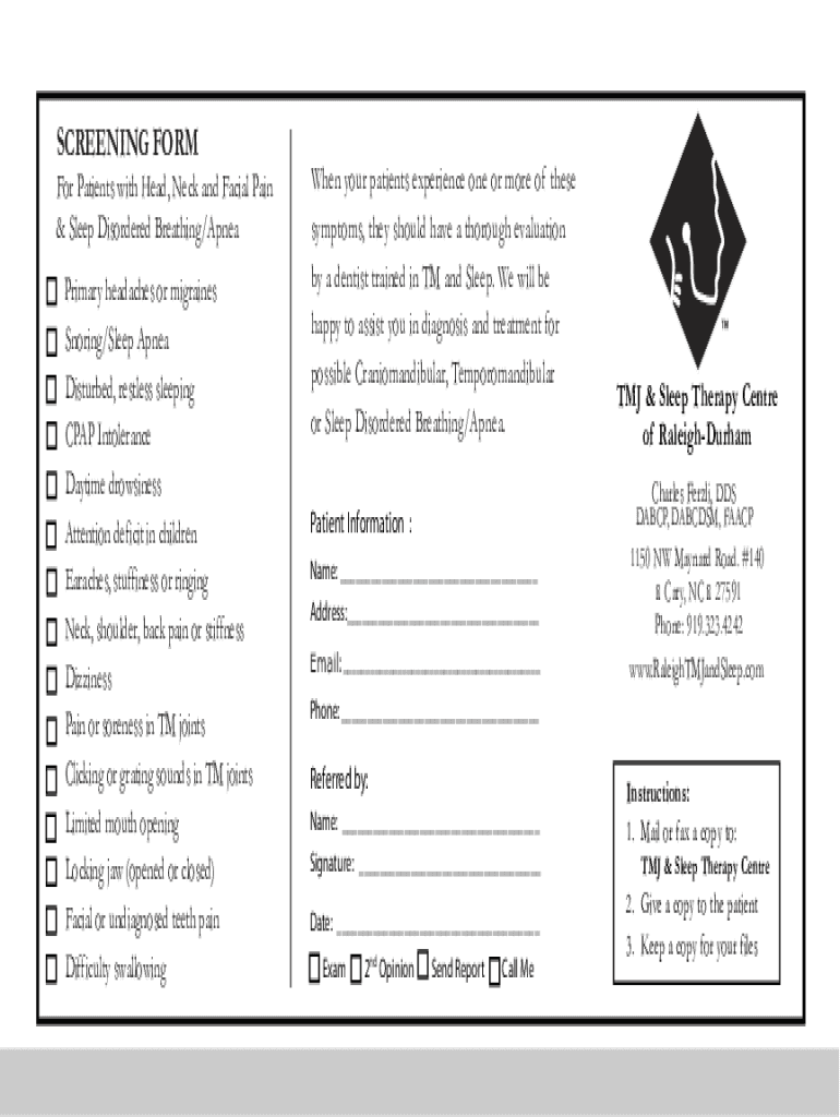 SCREENING Former Patients with Head, Neck and Facial Pain & Sleep Disordered Breathing/Apnea Primary headaches or migraines Snoring/Sleep Apnea Disturbed, restless sleeping CPAP Intolerance Daytime