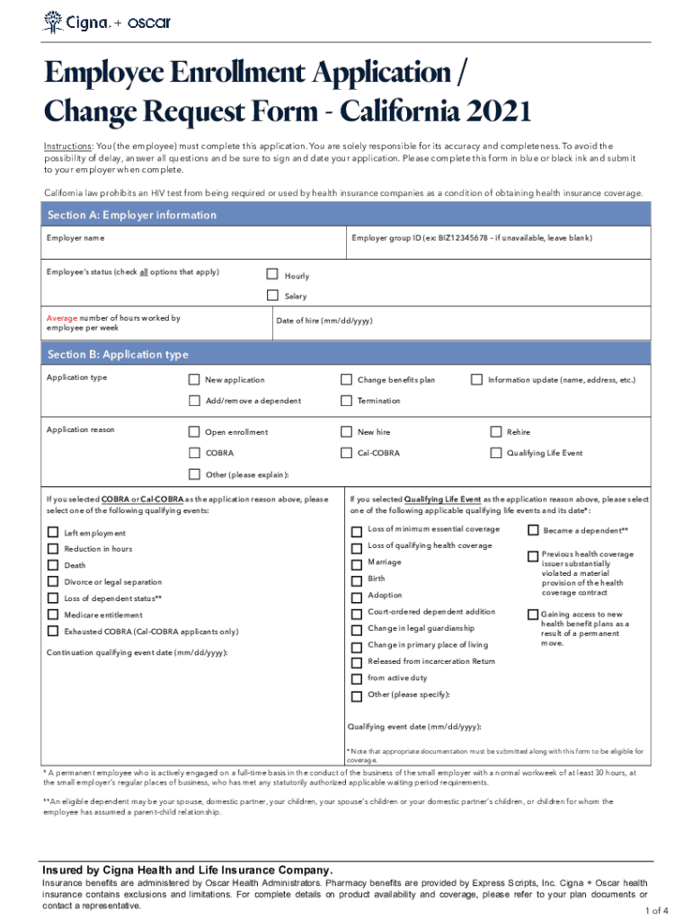 Employee Enrollment Application / Change Request Form California 2021 Instructions: You (the employee) must complete this application. You are solely responsible for its accuracy and completeness.