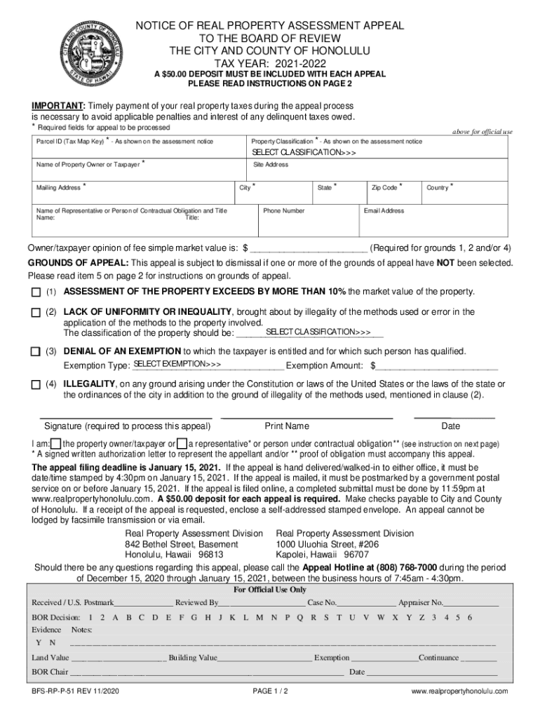 NOTICE OF REAL PROPERTY ASSESSMENT APPEAL TO THE BOARD OF REVIEW THE CITY AND COUNTY OF HONOLULU TAX YEAR: 20212022 A $50.00 DEPOSIT MUST BE INCLUDED WITH EACH APPEAL PLEASE READ INSTRUCTIONS ON PAGE