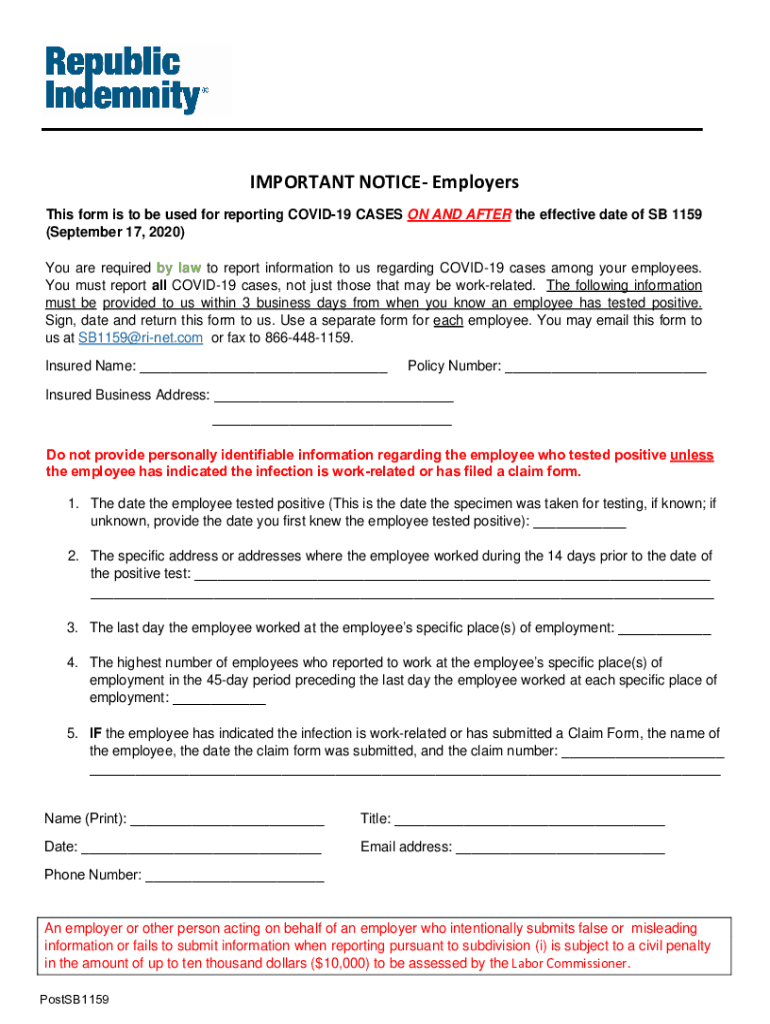 This form is to be used for reporting COVID-19 CASES ON AND AFTER the effective date of SB 1159