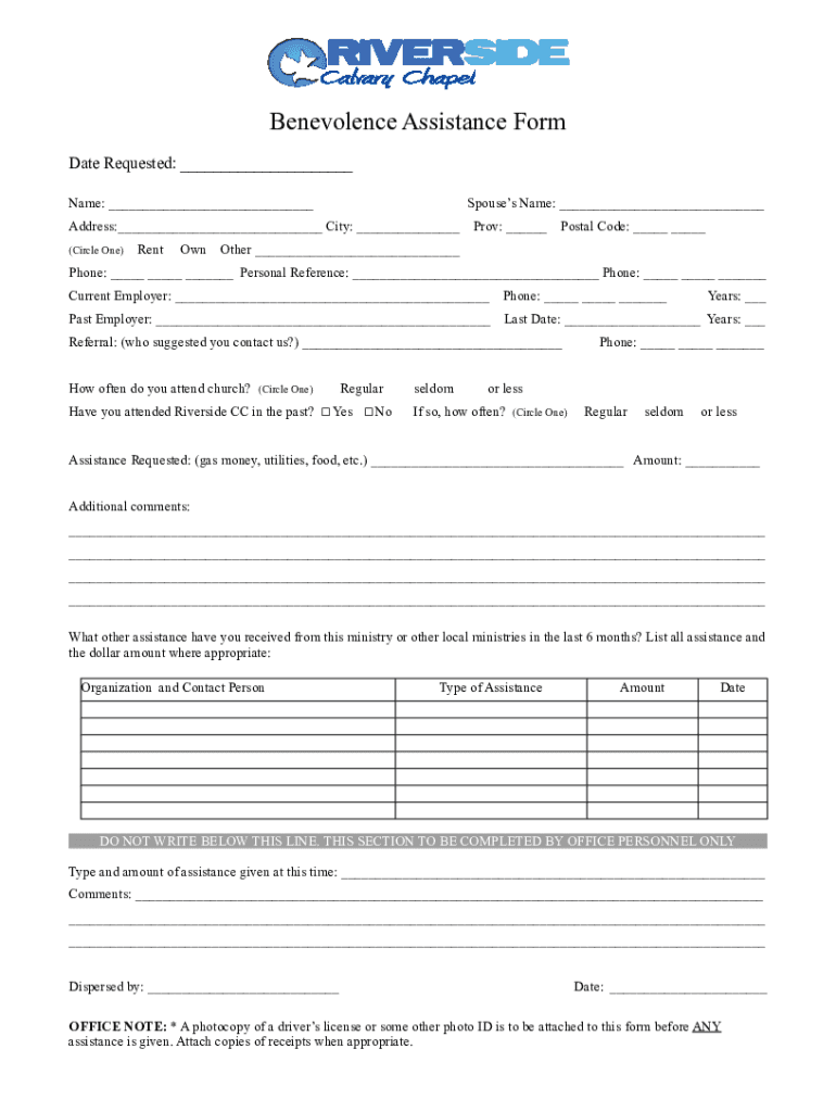 RIVERSIDE Calvary ChapelBenevolence Assistance Form Date Requested: Name: Spouses Name: Address: City: (Circle One)RentOwnProv: Postal Code: Other Phone: Personal Reference: Phone: Current Employer: