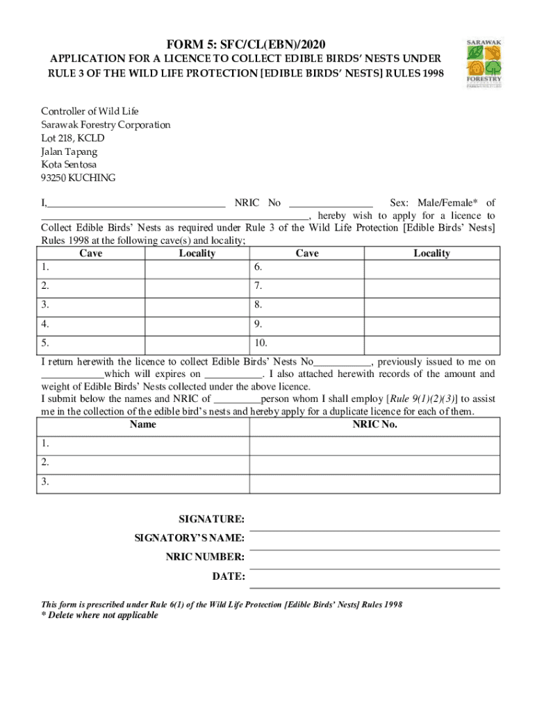 FORM 5: SFC/CL(CBN)/2020 APPLICATION FOR A License TO COLLECT EDIBLE BIRDS NESTS UNDER RULE 3 OF THE WILD LIFE PROTECTION EDIBLE BIRDS NESTS RULES 1998Controller of Wild Life Sarawak Forestry Corporation