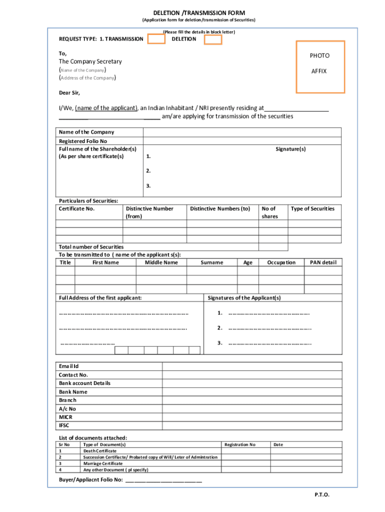 DELETION/TRANSMISSIONFORM (Applicationformfordeletion/transmissionofSecurities) (Pleasefillthedetailsinblockletter)REQUESTTYPE:1.TRANSMISSIONDELETION To, PHOTOTheCompanySecretary (NameoftheCompany)