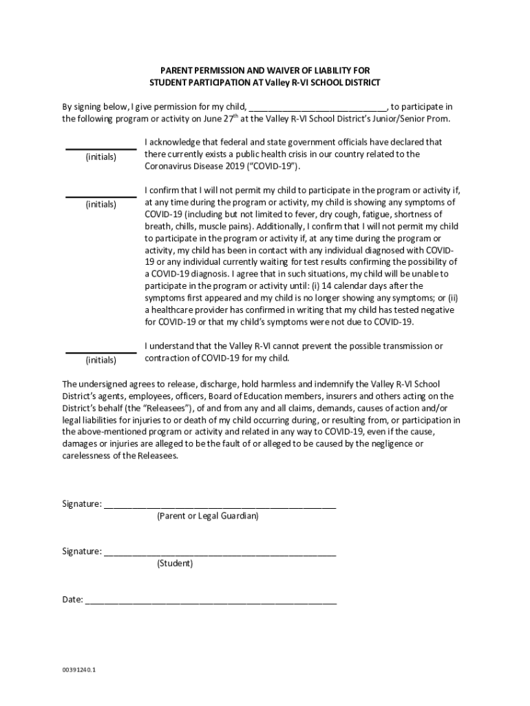 PARENT PERMISSION AND WAIVER OF LIABILITY FOR STUDENT PARTICIPATION AT Valley RVI SCHOOL DISTRICT By signing below, I give permission for my child, to participate in the following program or activity