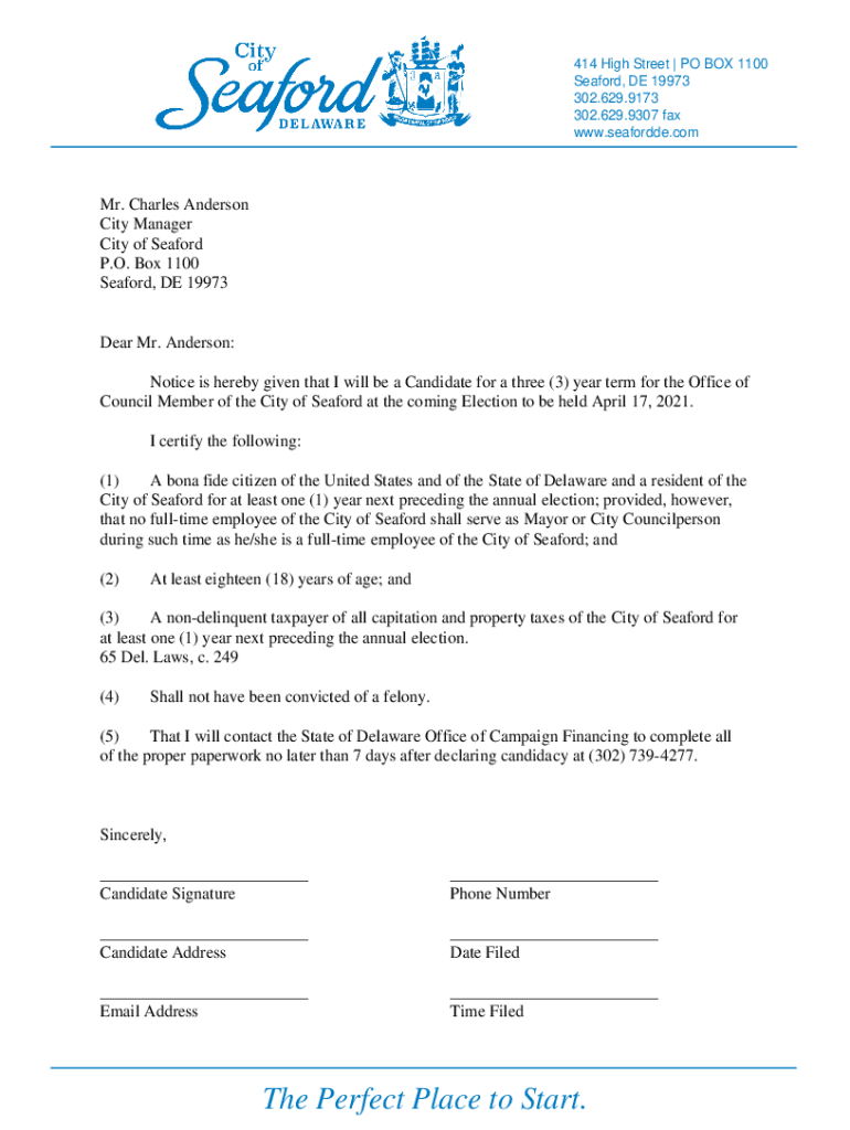 414 High Street PO BOX 1100 Seafood, DE 19973 302.629.9173 302.629.9307 fax www.seafordde.comMr. Charles Anderson City Manager City of Seafood P.O. Box 1100 Seafood, DE 19973Dear Mr. Anderson: Notice