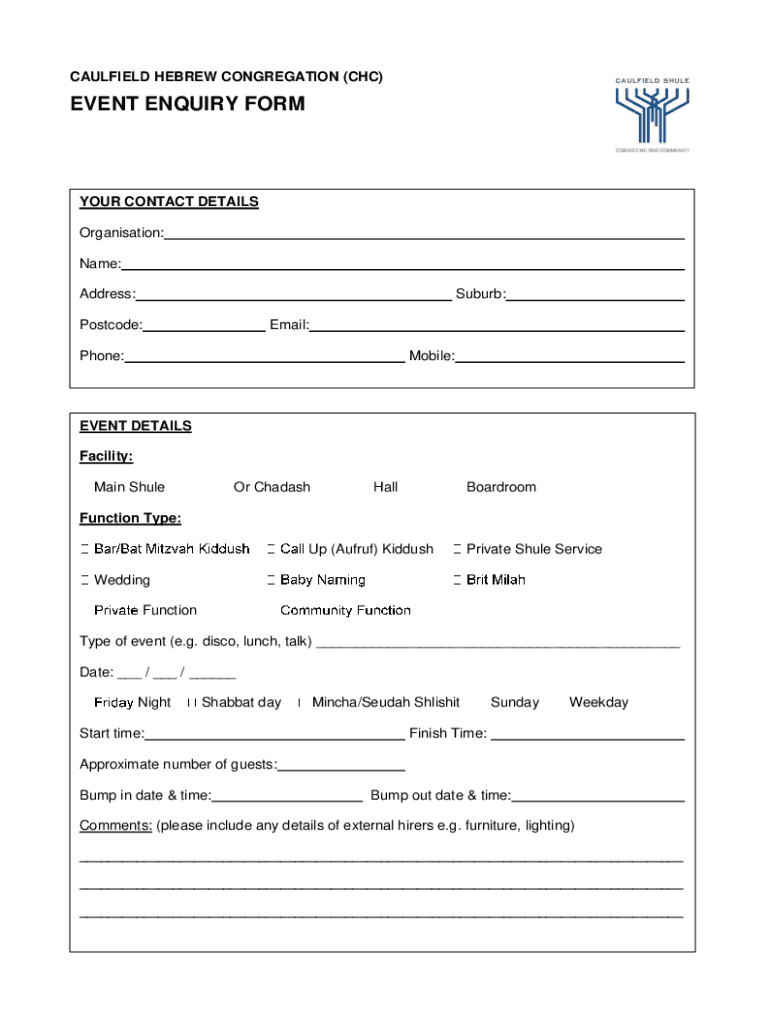 Get the free CAULFIELD HEBREW CONGREGATION (CHC) EVENT ENQUIRY FORM