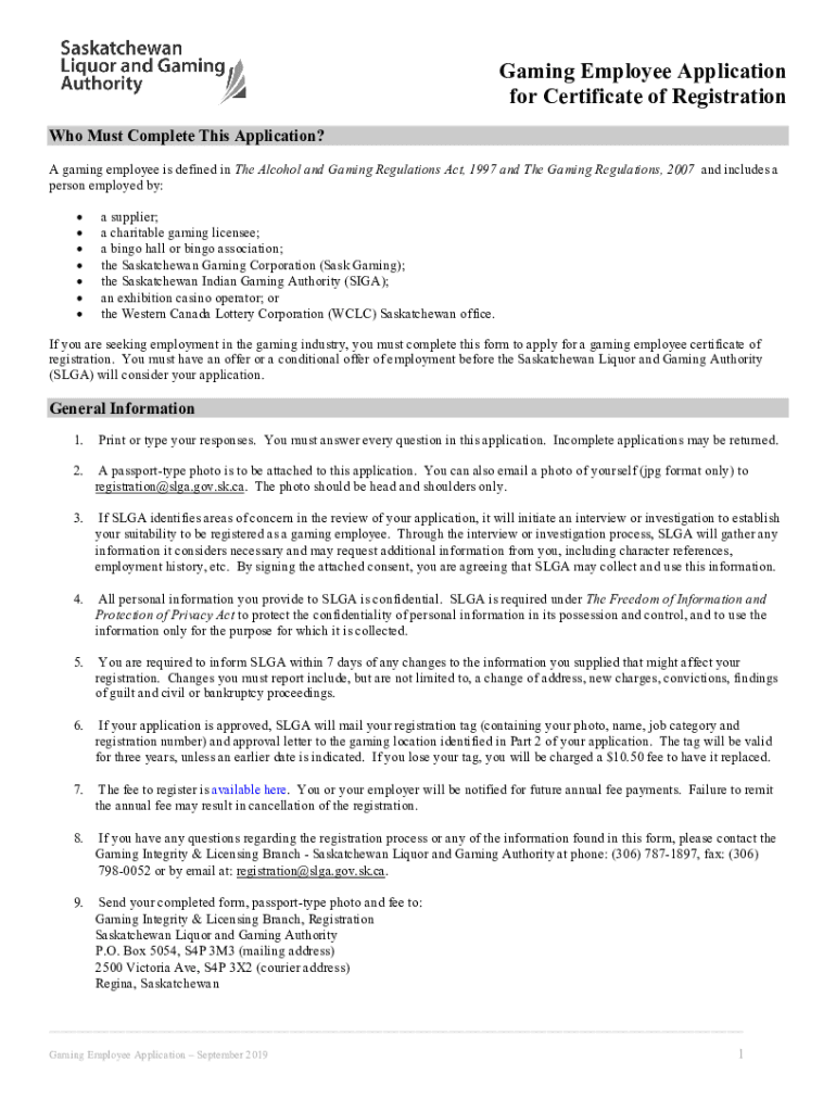 Gaming Employee Application for Certificate of Registration Who Must Complete This Application? A gaming employee is defined in The Alcohol and Gaming Regulations Act, 1997 and The Gaming Regulations,