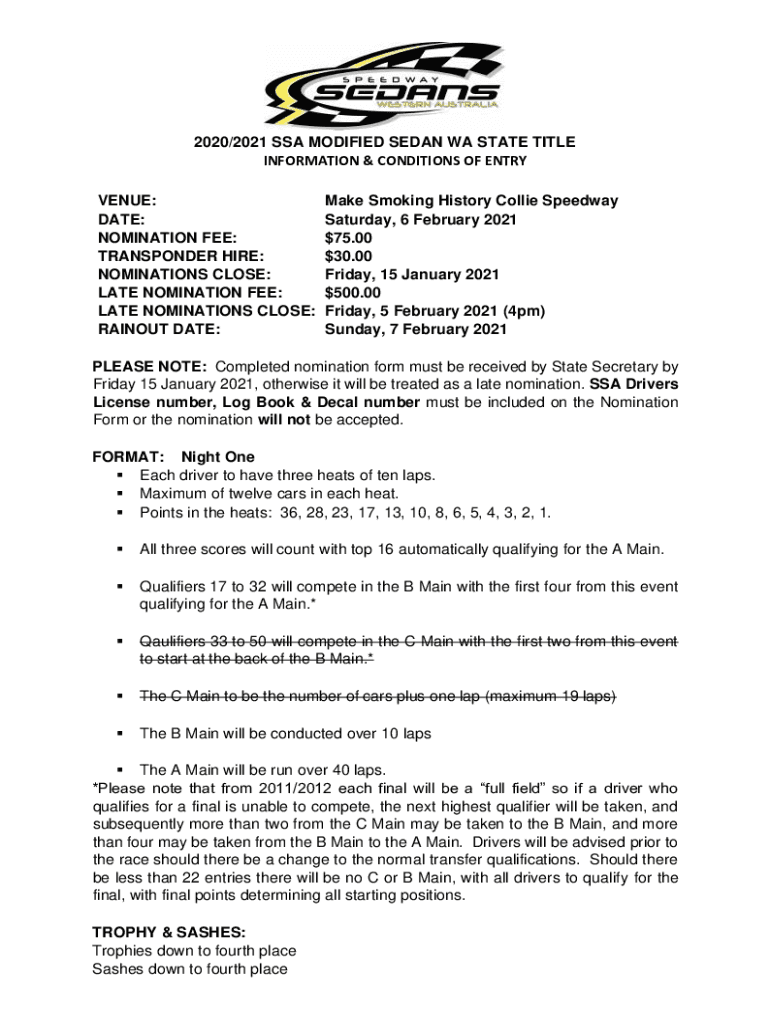 2020/2021 SSA MODIFIED SEDAN WA STATE TITLE INFORMATION & CONDITIONS OF ENTRY VENUE: DATE: NOMINATION FEE: TRANSPONDER HIRE: NOMINATIONS CLOSE: LATE NOMINATION FEE: LATE NOMINATIONS CLOSE: BAILOUT
