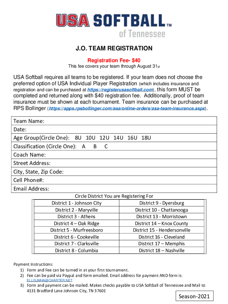 J.O. TEAM REGISTRATION Fee $40