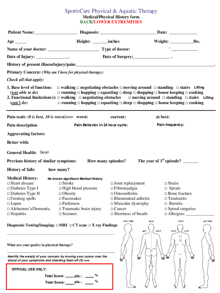 Sportswear Physical & Aquatic Therapy Medical/Physical History form BACK/LOWER EXTREMITIES Patient Name: Diagnosis: Date: Age Height: inchesWeight: lbs. :Name of your doctor: Type of doctor: Date
