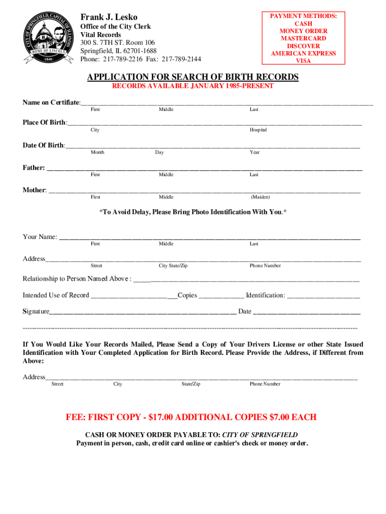 Frank J. LeskoPAYMENT METHODS: CASH MONEY ORDER MASTERCARD DISCOVER AMERICAN EXPRESS VISAOffice of the City Clerk Vital Records 300 S. 7TH ST. Room 106 Springfield, IL 627011688 Phone: 2177892216