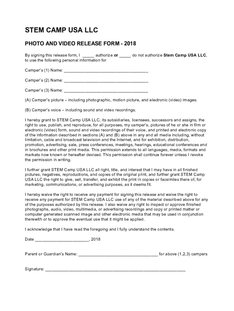 STEM CAMP USA LLC PHOTO AND VIDEO RELEASE FORM 2018 By signing this release form, I authorize or do not authorize Stem Camp USA LLC, to use the following personal information for Campers (1) Name: