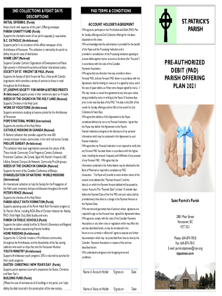 2ND COLLECTIONS & FEAST DAYS DESCRIPTIONS INITIAL OFFERING (Parish) Helps church with expenses of this year's Offering envelopes. PARISH CHARITY FUND (Parish) Supports the charitable works of our