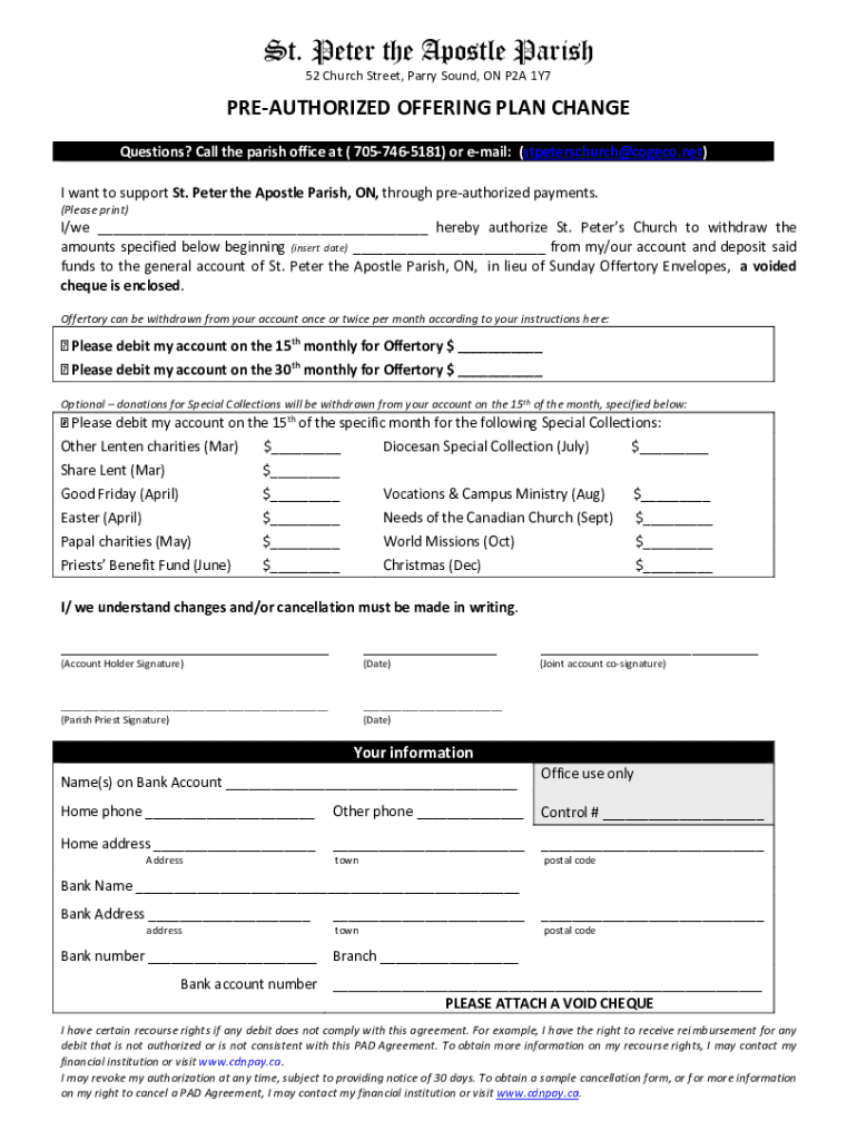 St. Peter the Apostle Parish 52 Church Street, Parry Sound, ON P2A 1Y7PREAUTHORIZED OFFERING PLAN CHANGE Questions? Call the parish office at (7057465181) or email: (stpeterschurch Costco.net) I want