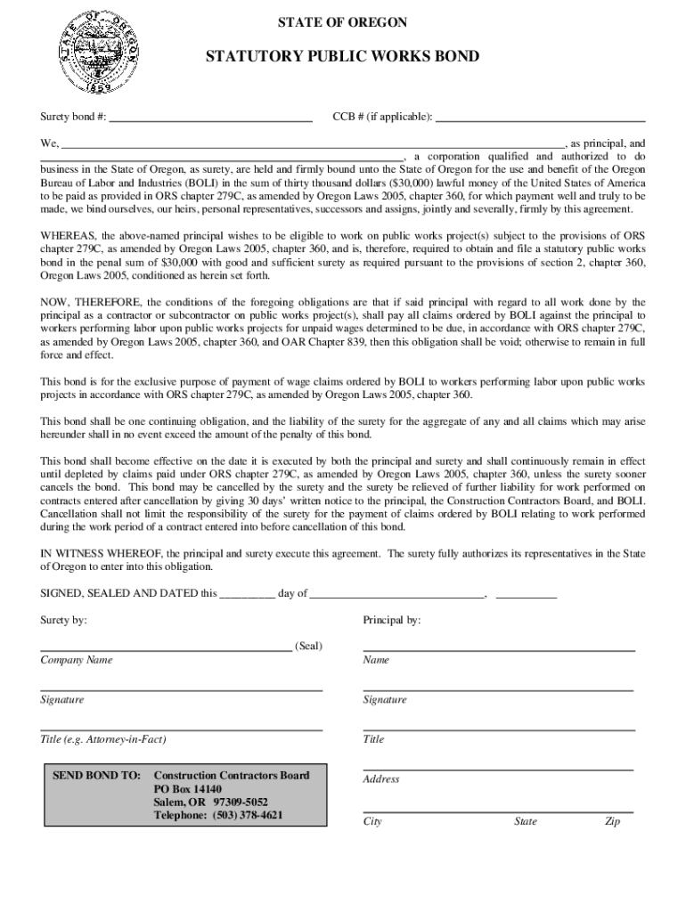 STATE OF OREGONSTATUTORY PUBLIC WORKS BONDSurety bond #:CCB # (if applicable):, as principal, and, a corporation qualified and authorized to do