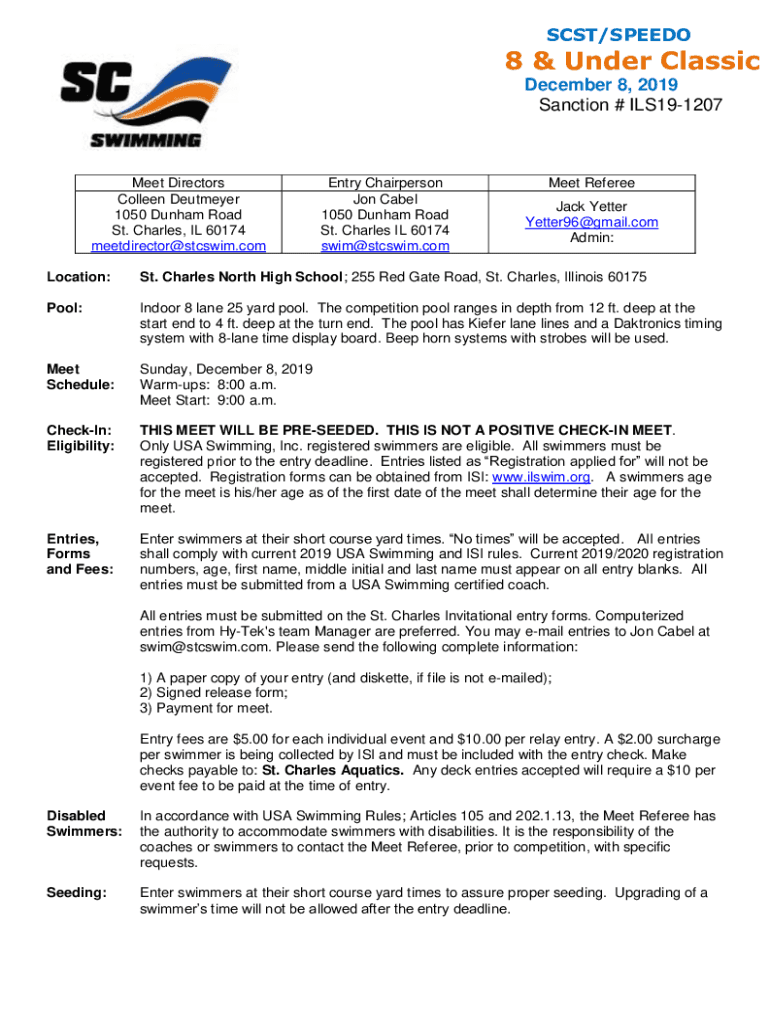 SCSI/SPEEDO8 & Under Classic December 8, 2019, Sanction # ILS191207Meet Directors Colleen Destroyer 1050 Dunham Road St. Charles, IL 60174 meet director swim. Coventry Chairperson Jon Label 1050 Dunham