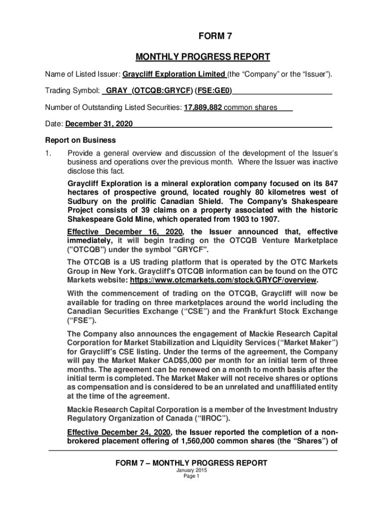Get the free Name of Listed Issuer: Graycliff Exploration Limited (the Company or the Issuer)