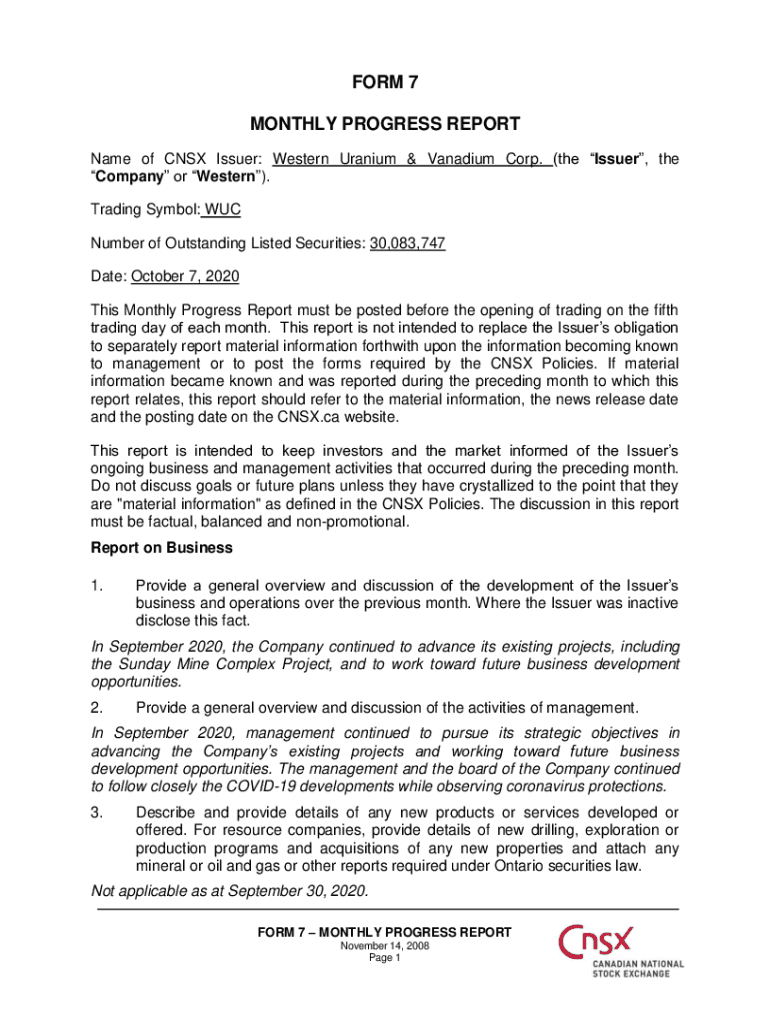 FORM 7 MONTHLY PROGRESS REPORT Name of CNS Issuer: Western Uranium & Vanadium Corp. (the Issuer, the Company or Western). Trading Symbol: WAC Number of Outstanding Listed Securities: 30,083,747 Date: