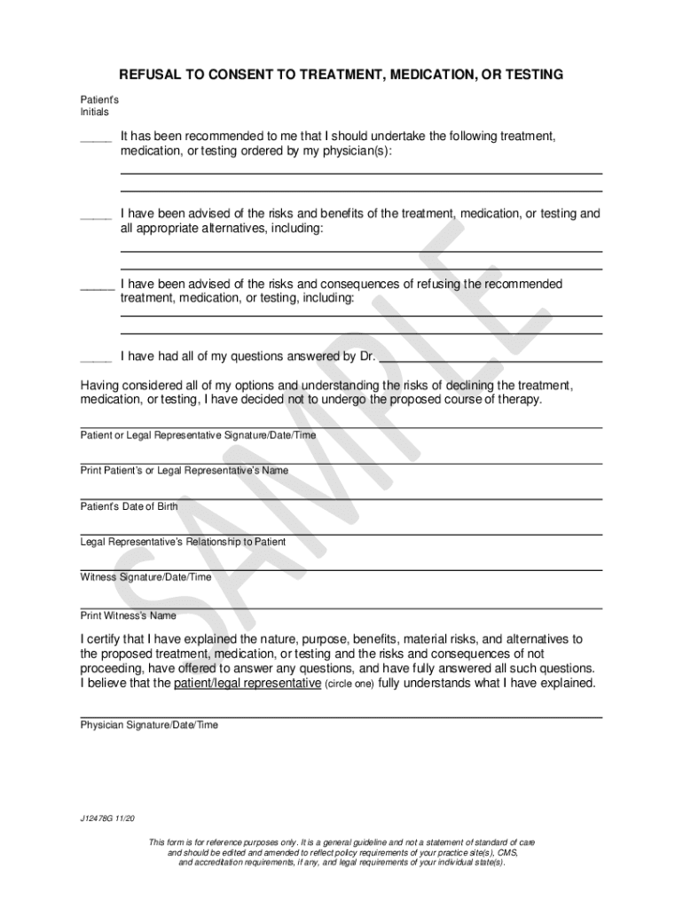 REFUSAL TO CONSENT TO TREATMENT, MEDICATION, OR TESTING Patients Initials It has been recommended to me that I should undertake the following treatment, medication, or testing ordered by my physician(s):