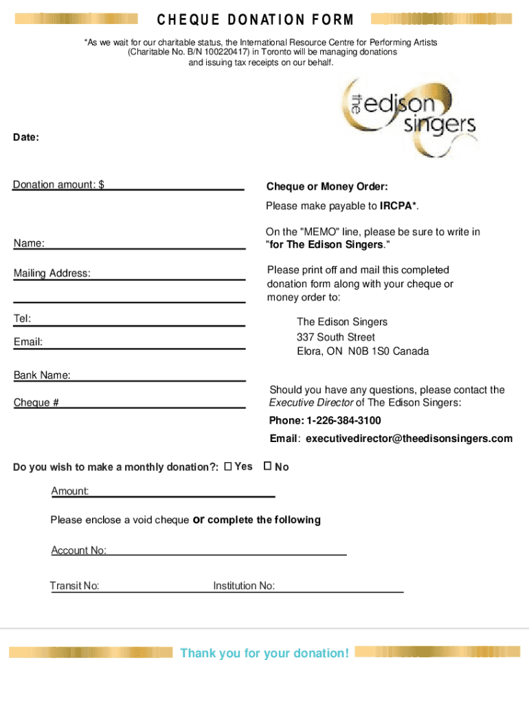C H E Q U E D O N AT I O N F O R M *As we wait for our charitable status, the International Resource Center for Performing Artists (Charitable No. B/N 100220417) in Toronto will be managing donations