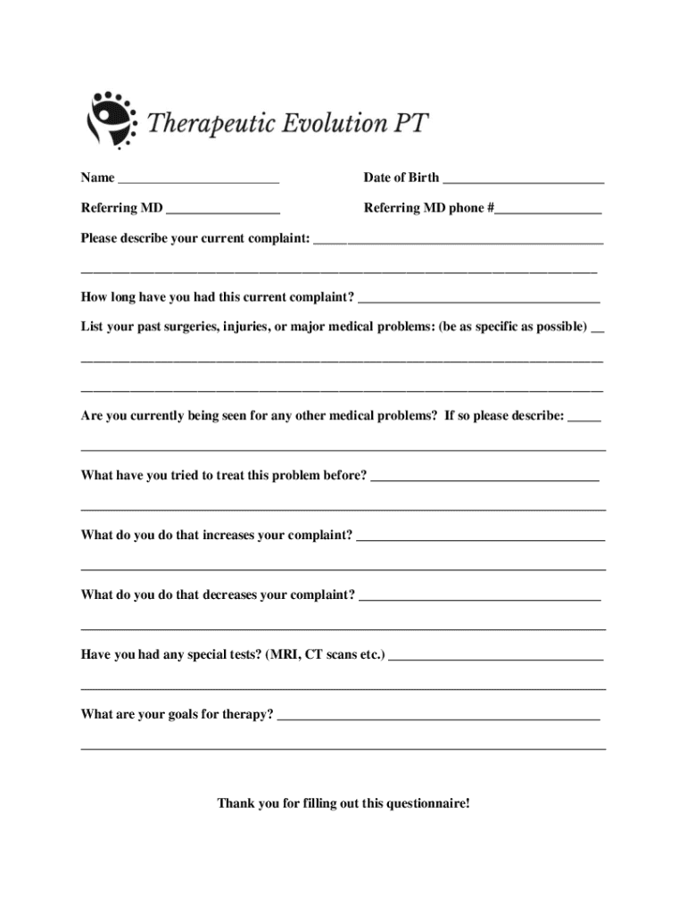Name Date of Birth Referring MD phone # Please describe your current complaint: How long have you had this current complaint? List your past surgeries, injuries, or major medical problems: (be as
