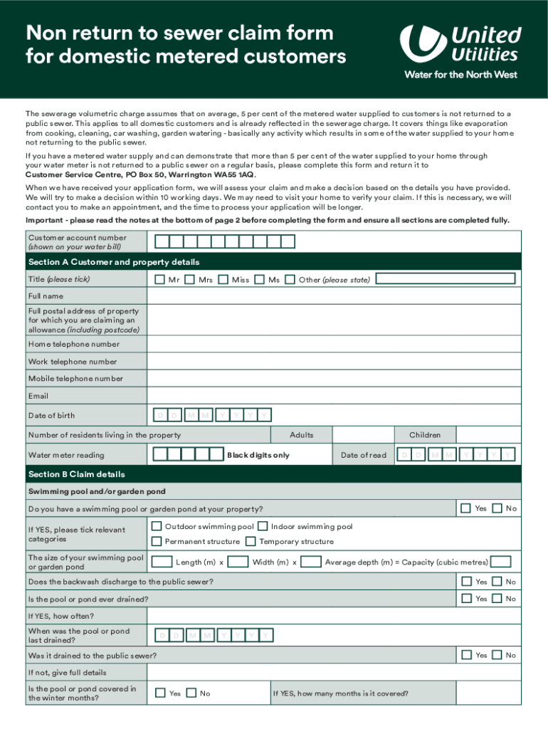 Non return to sewer claim form for domestic metered customers united, :::, UtilitiesWater for the North West sewerage volumetric charge assumes that on average, 5 per cent of the metered water supplied