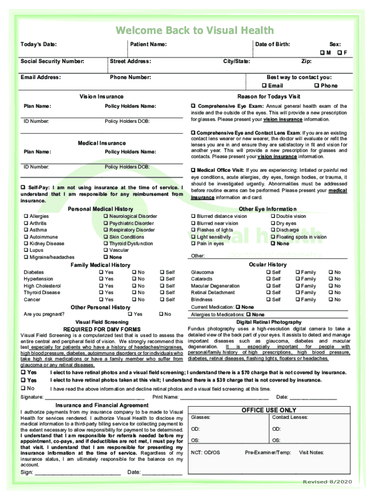 Welcome Back to Visual Health Today's Date:Patient Name:Date of Birth:Sex: Social Security Number:Street Address:Email Address:Phone Number:City/State:Vision InsuranceReason for Today's VisitPolicy