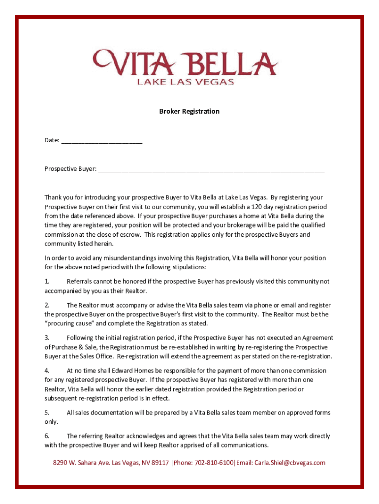 Broker RegistrationDate: Prospective Buyer: Thank you for introducing your prospective Buyer to Vita Bella at Lake Las Vegas. By registering your Prospective Buyer on their first visit to our community,