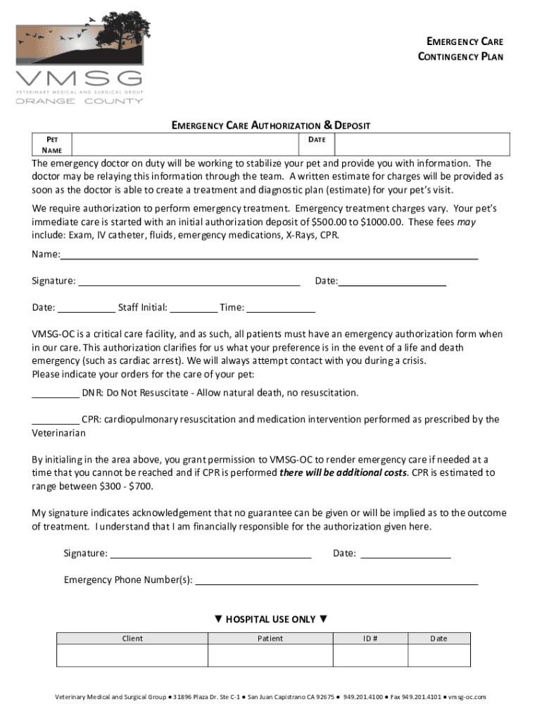 EMERGENCY CARECONTINGENCY PLANEMERGENCY CARE AUTHORIZATION & DEPOSITDATEPETNAMEThe emergency doctor on duty will be working to stabilize your pet and provide you with information. The doctor may be