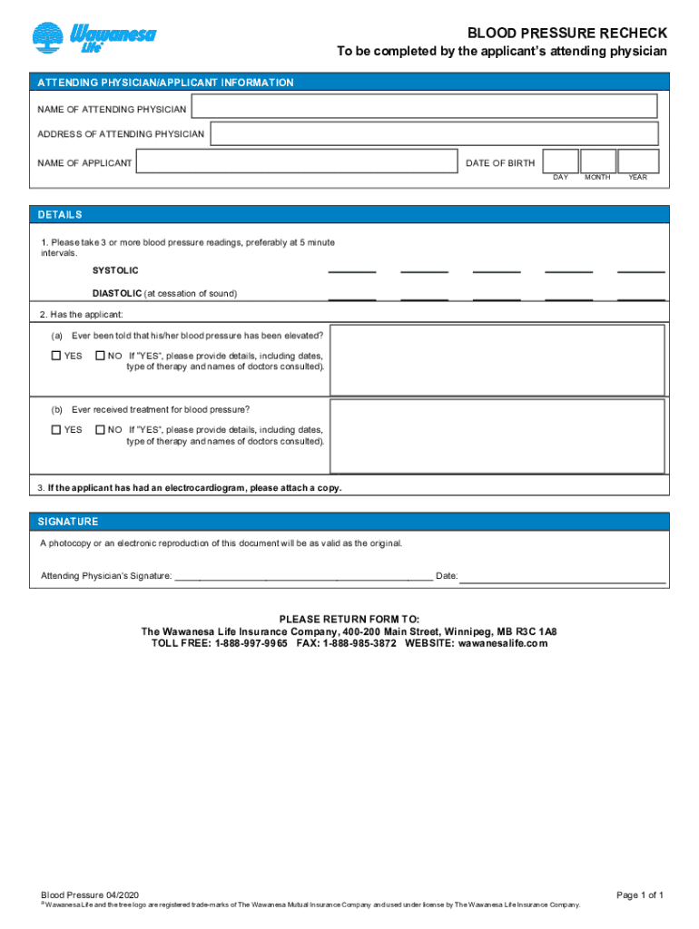 PrintResetBLOOD PRESSURE Recheck be completed by the applicants attending physician/APPLICANT INFORMATION NAME OF ATTENDING PHYSICIAN ADDRESS OF ATTENDING PHYSICIAN NAME OF APPLICANTDATE OF BIRTH