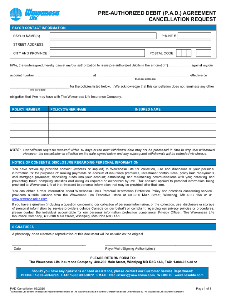 Get the free PRE-AUTHORIZED DEBIT (P.A.D.) AGREEMENT CANCELLATION REQUEST