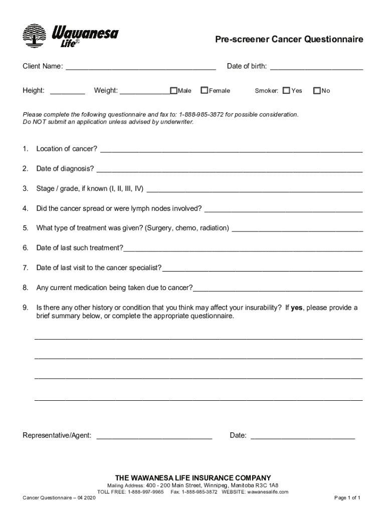 PrintSaveClearPrescreener Cancer Questionnaire Client Name: Height: Weight: Mandate of birth: FemaleSmoker: Yes Please complete the following questionnaire and fax to: 18889853872 for possible consideration.
