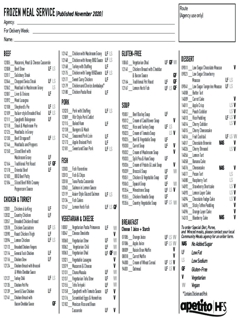 FROZEN MEAL SERVICE (Published November 2020)Route (Agency use only)Agency: For Delivery Week: Name:BEEF 12005 Macaroni, Meat & Cheese Casserole 12008 Beef Stew OF 12017 Salisbury Steak 12046 Chopped