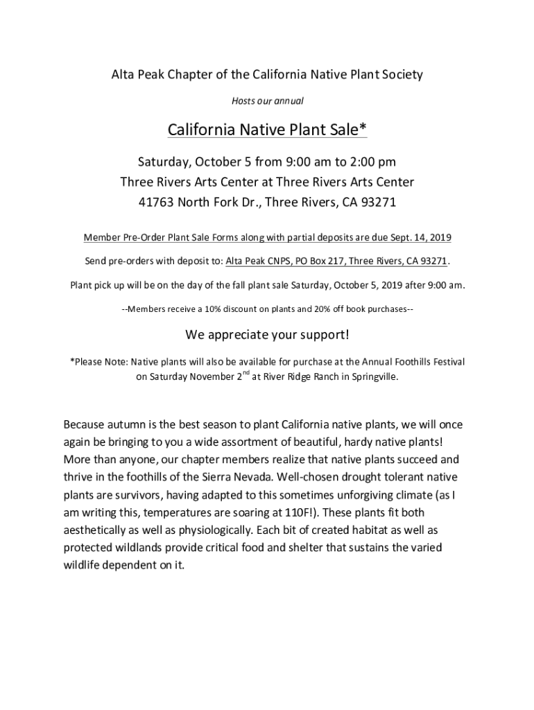Alta Peak Chapter of the California Native Plant Society Hosts our annual California Native Plant Sale*Saturday, October 5 from 9:00 am to 2:00 three Rivers Arts Center at Three Rivers Arts Center41763 North Fork Dr., Three Rivers, CA 93271Member PreOrder Plant Sale Forms along with partial deposits are due Sept. 14, 2019Send preorders with deposit to: Alta Peak CNPS, PO Box 217, Three Rivers, CA 93271.