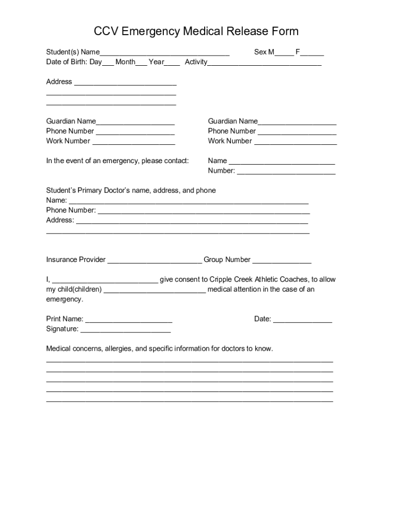 CCV Emergency Medical Release Form Student(s) Name Sex M F Date of Birth: Day Month Year Activity Address Guardian Name Phone Number Work Number Guardian Name Phone Number Work Number In the event