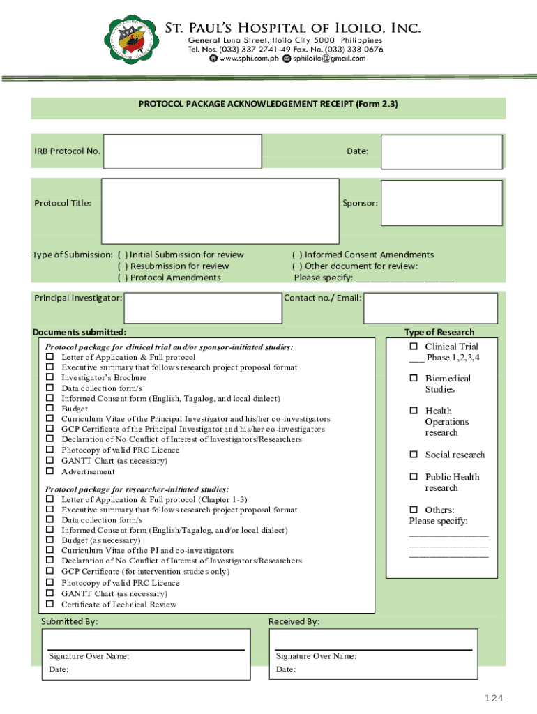 PROTOCOL PACKAGE ACKNOWLEDGEMENT RECEIPT (Form 2.3)IRB Protocol No. Date:Protocol Title:Type of Submission: () Initial Submission for review () Resubmission for review () Protocol Amendments Principal