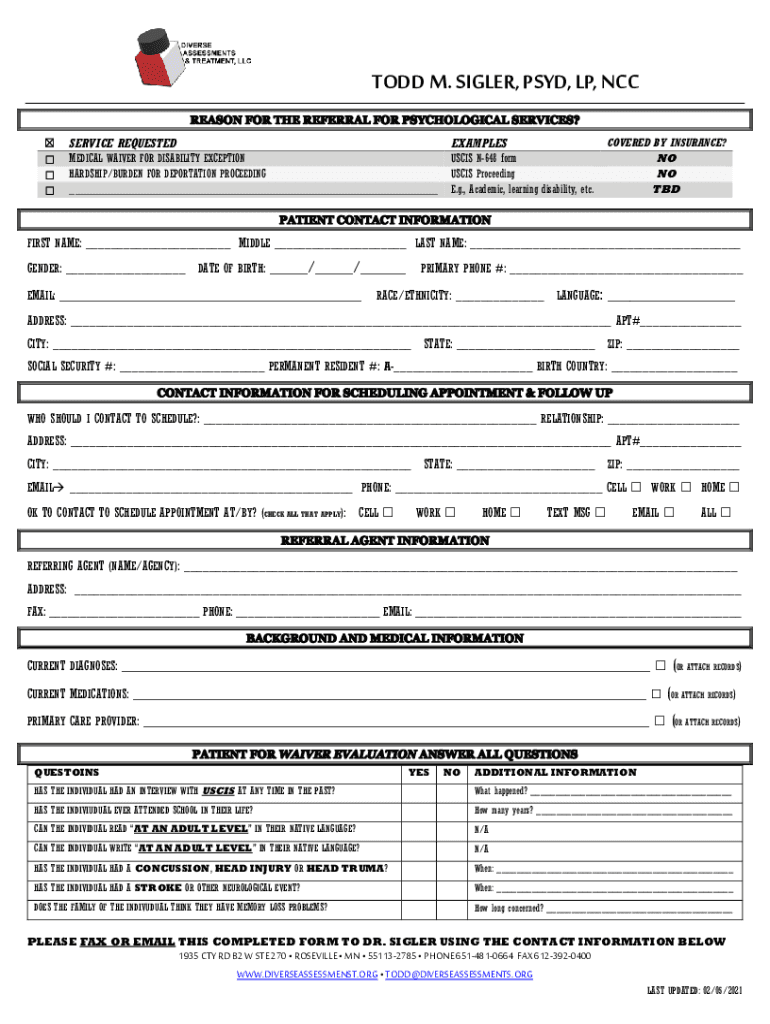 TODD M. SIGNER, PSD, LP, NCC SERVICE REQUESTEDEXAMPLESMEDICAL WAIVER FOR DISABILITY EXCEPTION HARDSHIP/BURDEN FOR DEPORTATION PROCEEDING USCIS N648 form USCIS Proceeding E.g., Academic, learning disability,