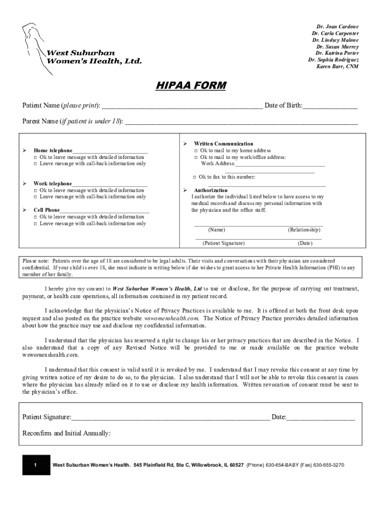 Dr. Joan Car done Dr. Carla Carpenter Dr. Lindsey Malone Dr. Susan Murray Dr. Katrina Porter Dr. Sophia Rodriguez Karen Barr, HIPAA FORM Patient Name (please print): Date of Birth: Parent Name (if