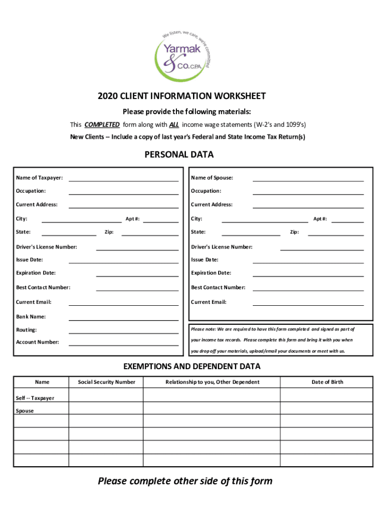 2020 CLIENT INFORMATION WORKSHEET Please provide the following materials: This COMPLETED form along with ALL income wage statements (W2's and 1099's) New Clients Include a copy of last year's Federal