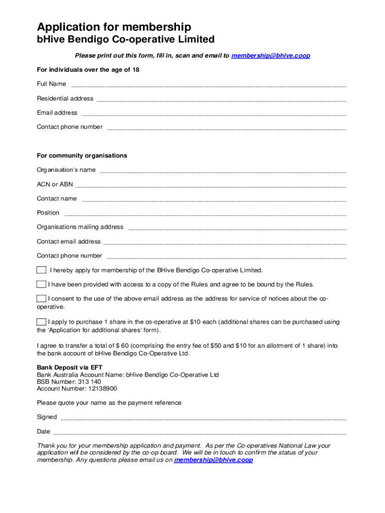 Application for membership hive Bendigo Cooperative Limited Please print out this form, fill in, scan and email to membership hive. Coop For individuals over the age of 18 Full Name Residential address
