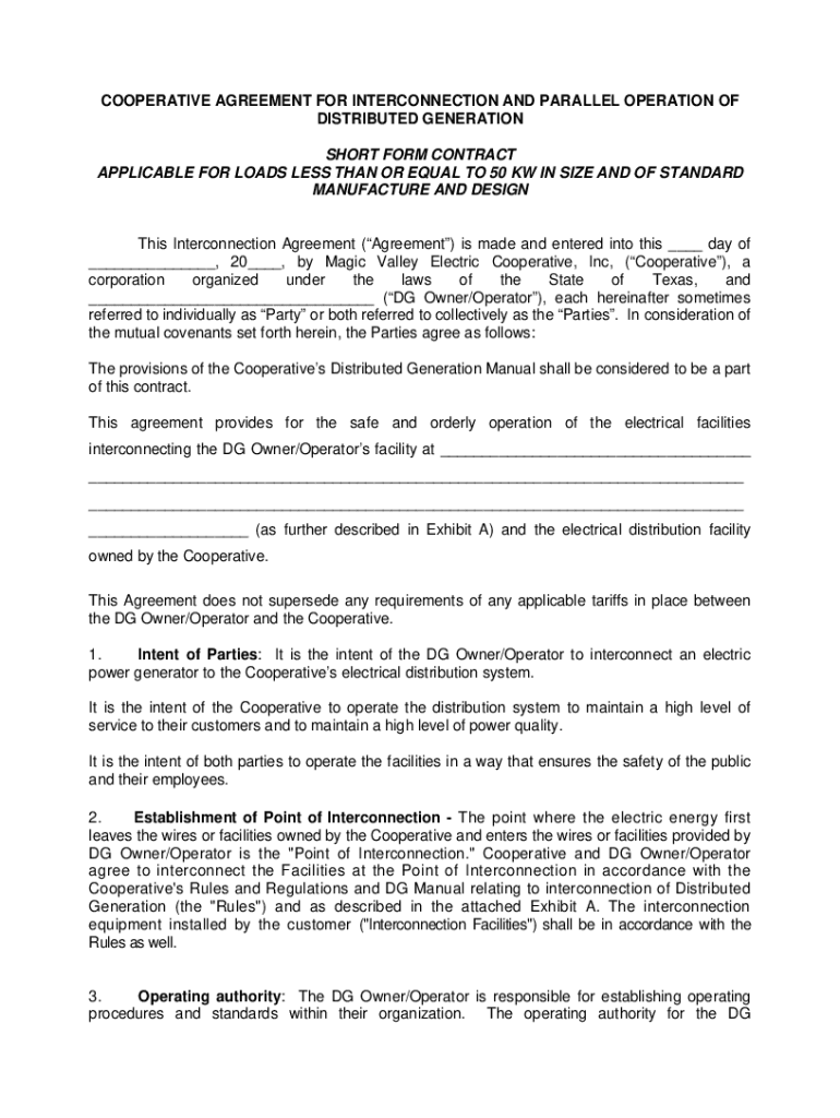 COOPERATIVE AGREEMENT FOR INTERCONNECTION AND PARALLEL OPERATION OF DISTRIBUTED GENERATION SHORT FORM CONTRACT APPLICABLE FOR LOADS LESS THAN OR EQUAL TO 50 KW IN SIZE AND OF STANDARD MANUFACTURE