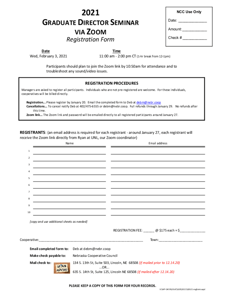 2021 GRADUATE DIRECTOR SEMINAR VIA ZOOM NCC Use Only Date: Amount: Check # Registration Format Wed, February 3, 2021Time 11:00 am 2:00 pm CT (1hr break from 121pm)Participants should plan to join