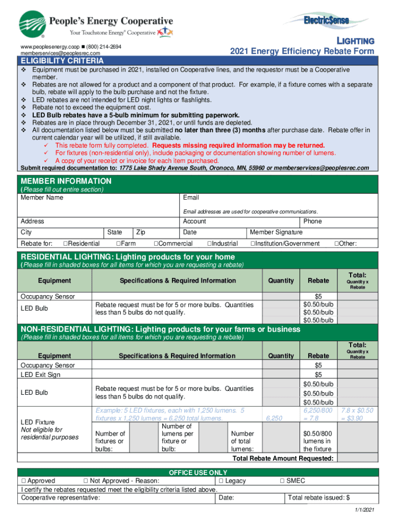 WWW.peoples energy. Coop (800) 2142694 member services peoples rec.com2021 Energy Efficiency Rebate FormELIGIBILITY CRITERIA Equipment must be purchased in 2021, installed on Cooperative lines, and