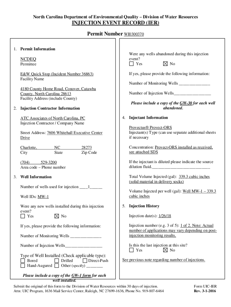 North Carolina Department of Environmental Quality Division of Water ResourcesINJECTION EVENT RECORD (HER) Permit Number WI0300370 1. Permit Information Were any wells abandoned during this injection