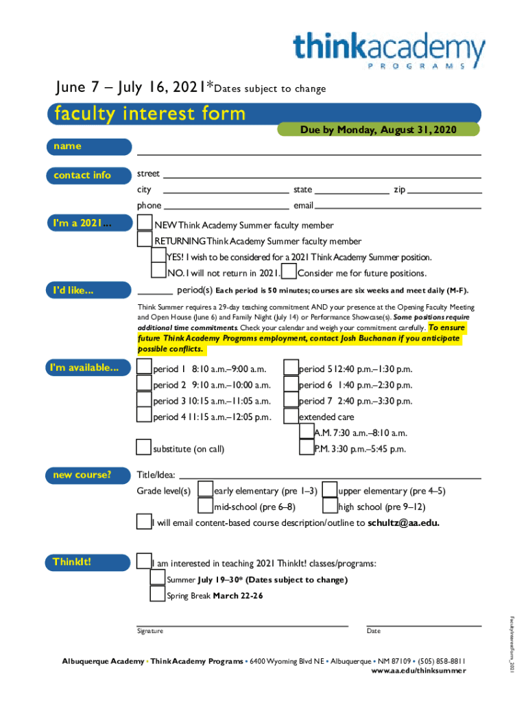 June 7 July 16, 2021* Dates subject to change faculty interest fondue by Monday, August 31, 2020name contact info street city state zip phone email'm a 2021...NEW Think Academy Summer faculty member